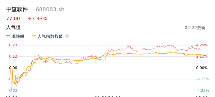 04月22日,中望软件收报77.00,股价涨幅3.33%,成交金额9963.10万元,换手率1.08%。