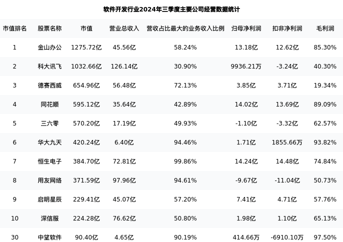 中望软件最新报告期数据为三季度,下表汇总了软件开发行业内市值靠前的公司三季度主要经营数据