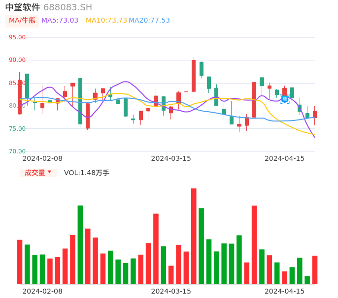 04月15日,中望软件收报78.78,股价涨幅1.88%,成交金额1.16亿元,换手率1.22%。