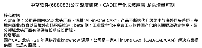 值得注意的是:2024年04月国海证券的刘熹分析师,首次发布关于中望软件的研究报告,标题为:中望软件(688083)公司深度研究:CAD国产化长坡厚雪 龙头增量可期。