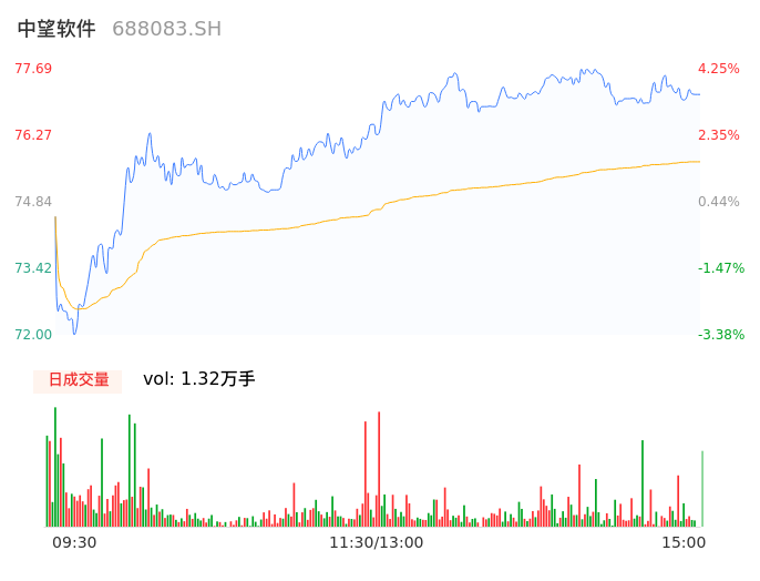 04月22日,中望软件收报77.00,股价涨幅3.33%,成交金额9963.10万元,换手率1.08%。