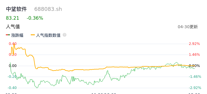 04月30日,中望软件收报83.21,股价涨幅-0.36%,成交金额9474.00万元,换手率0.95%。