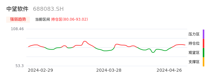 我们来看一下该股的九方特色指标强弱趋势的情况:中望软件自04月23日从观望区上穿到持仓区。股价近期在多头区域回调整理。后续重点关注多空分界点的争夺:80.06元。如未能有效站稳则可能重新回到空头行情。