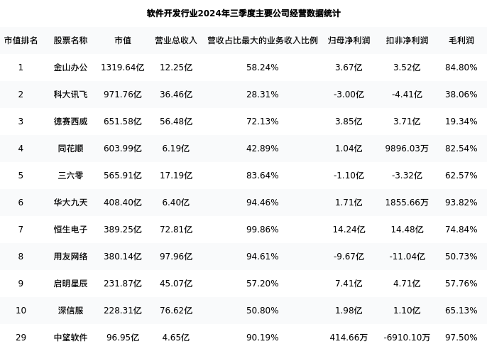 中望软件最新报告期数据为三季度,下表汇总了软件开发行业内市值靠前的公司三季度主要经营数据
