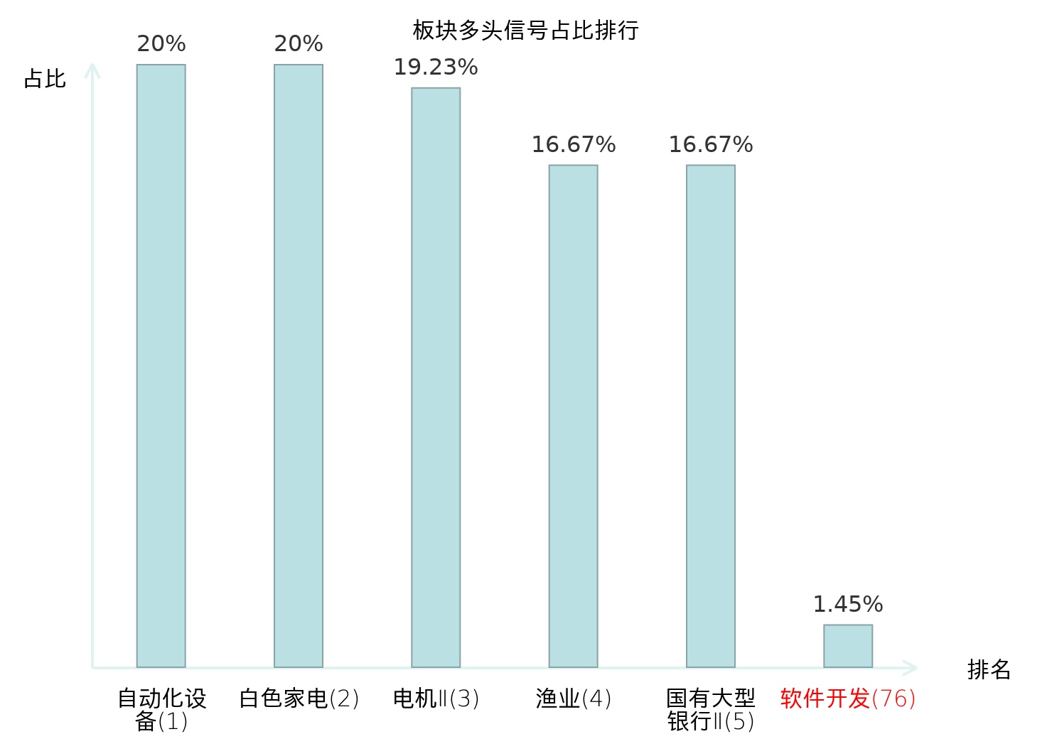 全市场所有行业板块中主力多头信号占比排名中,自动化设备板块位居第一。渔业板块名次提升最快,较昨日上升118位。