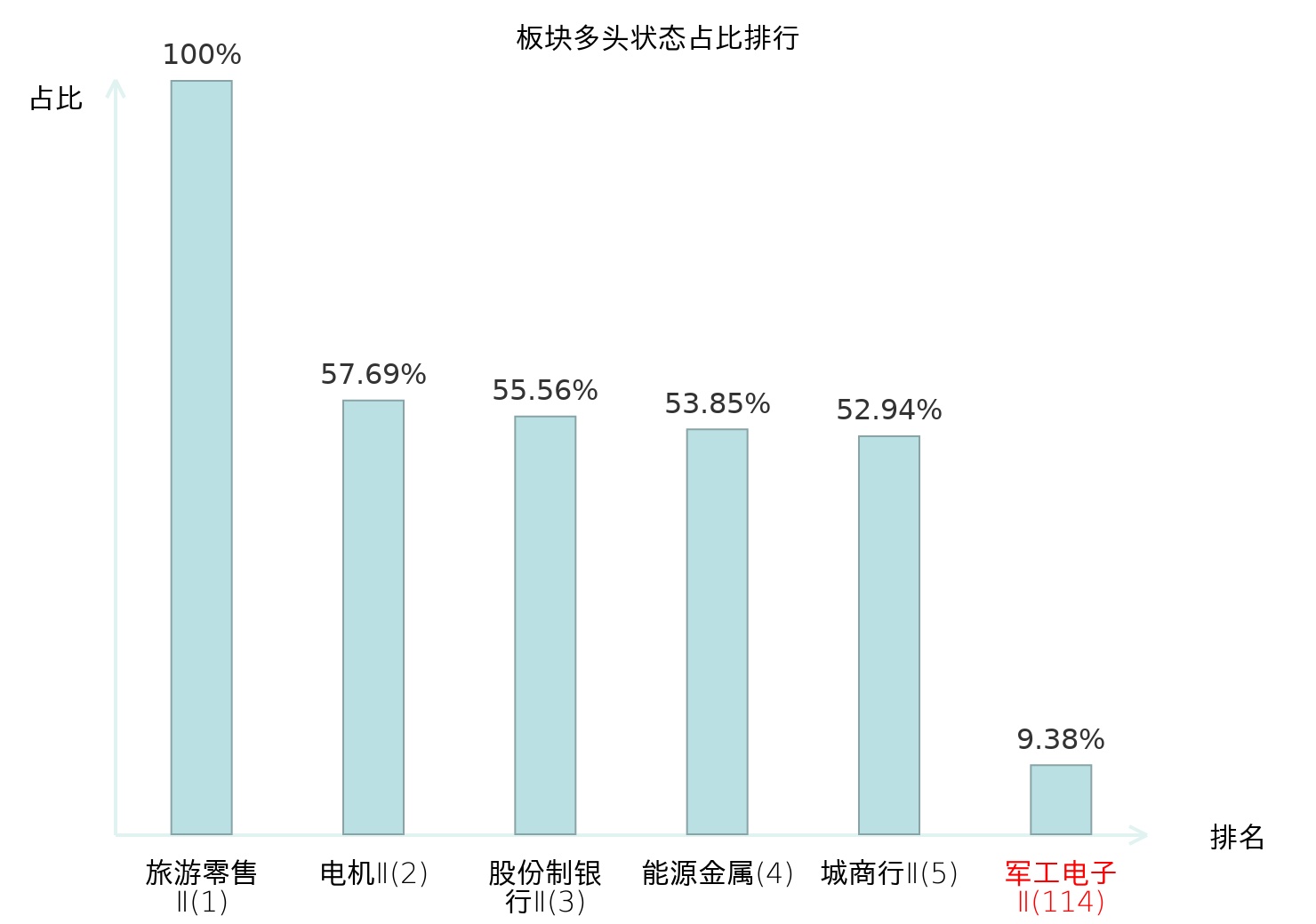 全市场所有行业板块中主力多头状态占比排名中,旅游零售Ⅱ板块位居第一。地面兵装Ⅱ板块名次提升最快,较昨日上升99位。