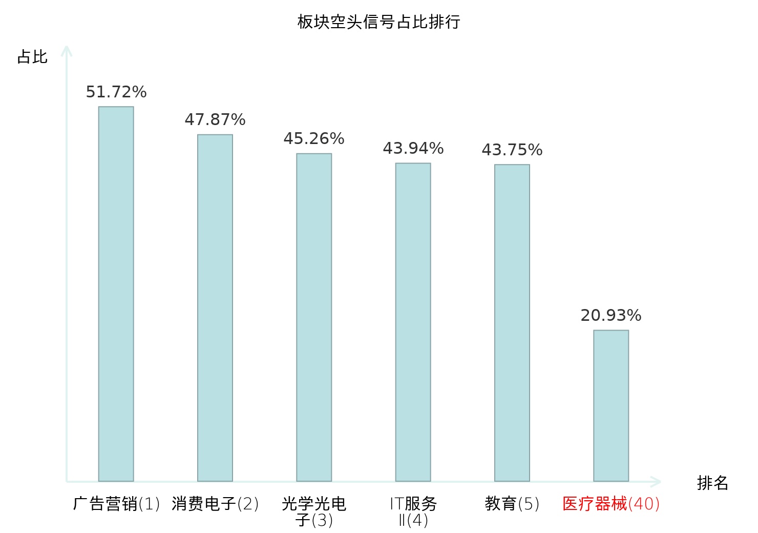 全市场所有行业板块中主力空头信号占比排名中,广告营销板块位居第一。广告营销板块名次提升最快,较昨日上升115位。