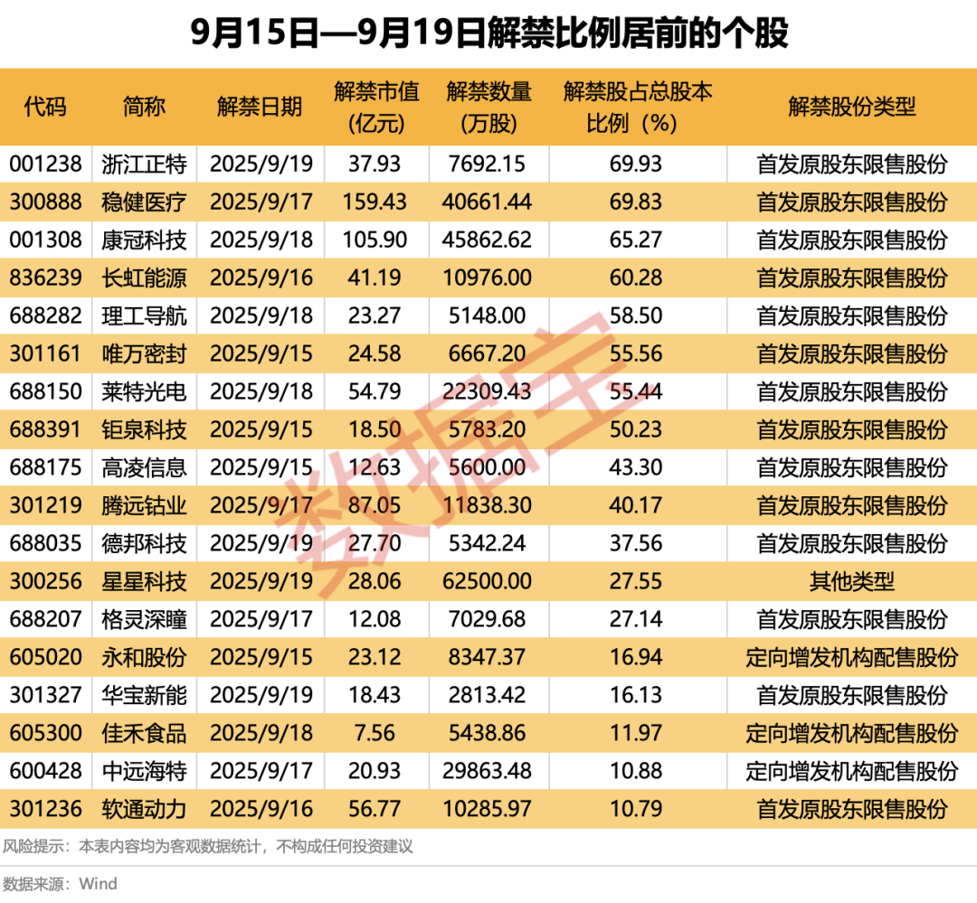 据证券时报·数据宝统计,下周(9月15日至19日),A股市场将有47家上市公司迎来限售股解禁。以个股最新价计算,下周解禁股对应市值合计高达785.47亿元。