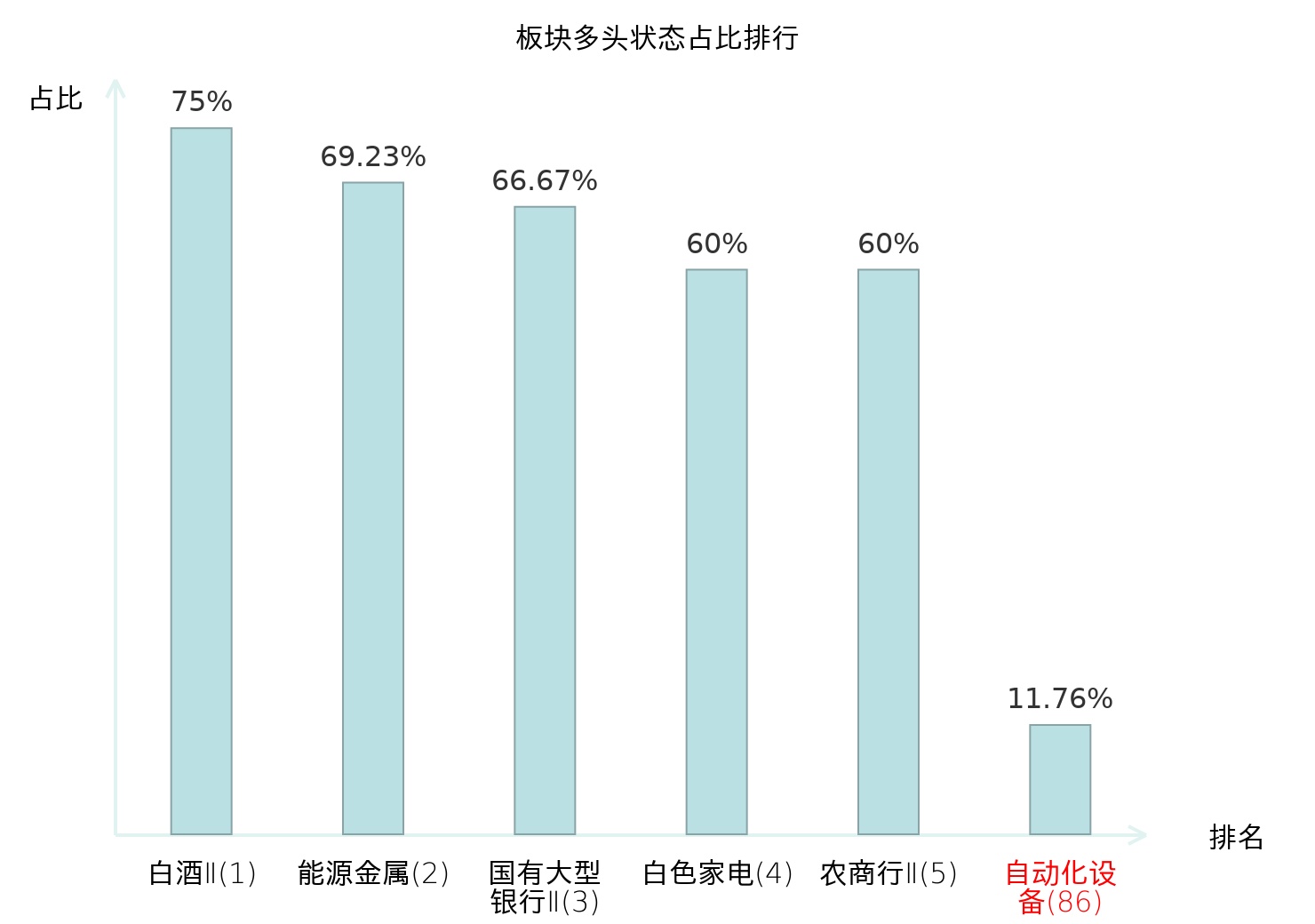全市场所有行业板块中主力多头状态占比排名中,白酒Ⅱ板块位居第一。房地产服务板块名次提升最快,较昨日上升86位。