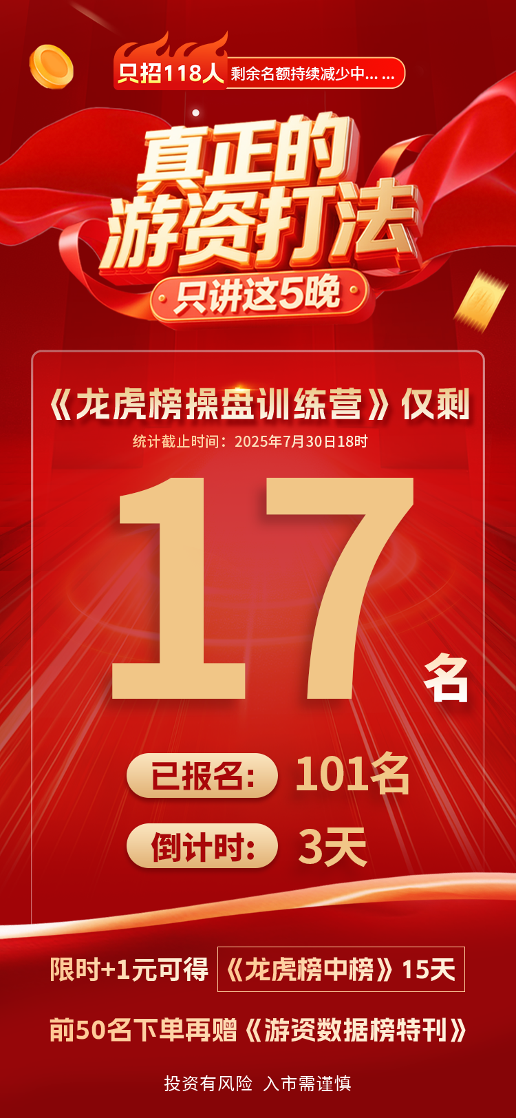5天直播教学,带你拆懂龙虎榜、读透资金节奏。每天一节直播+当日龙虎榜金股实战复盘,讲的全是市场里的真实战法。课程已正式上线,限时只开一周,封班118人,名额用完即止!