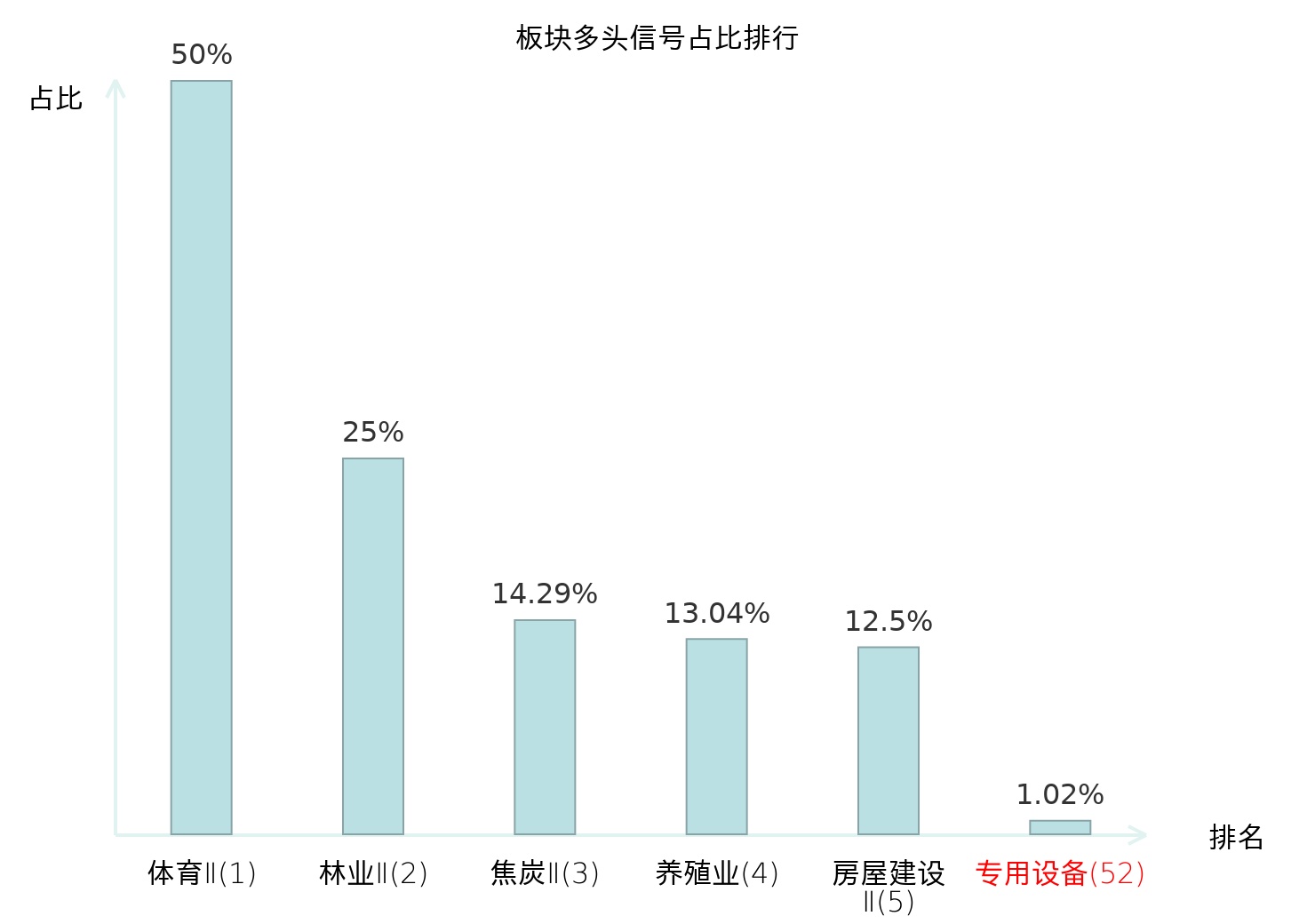 全市场所有行业板块中主力多头信号占比排名中,体育Ⅱ板块位居第一。体育Ⅱ板块名次提升最快,较昨日上升130位。