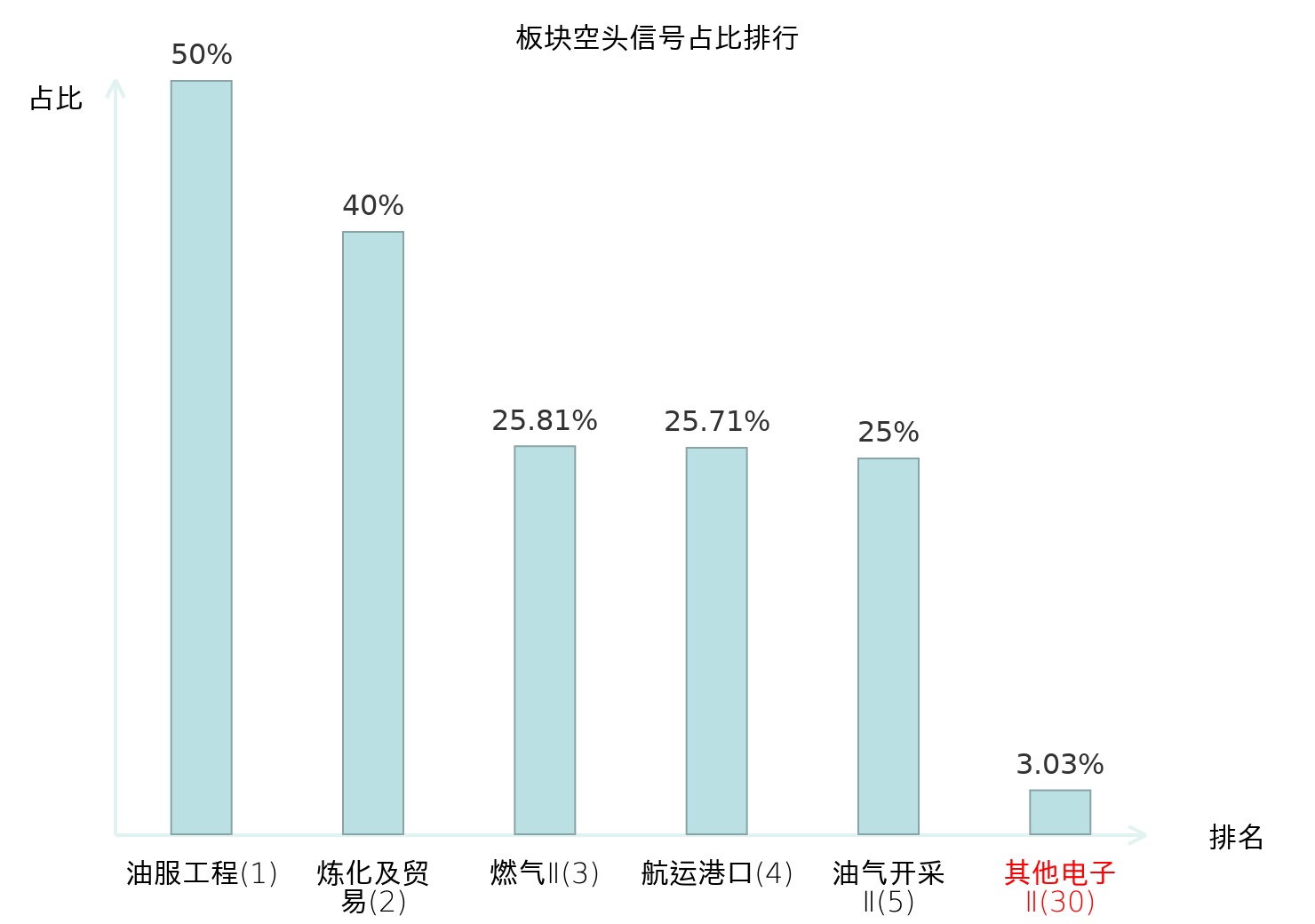 全市场所有行业板块中主力空头信号占比排名中,油服工程板块位居第一。炼化及贸易板块名次提升最快,较昨日上升124位。