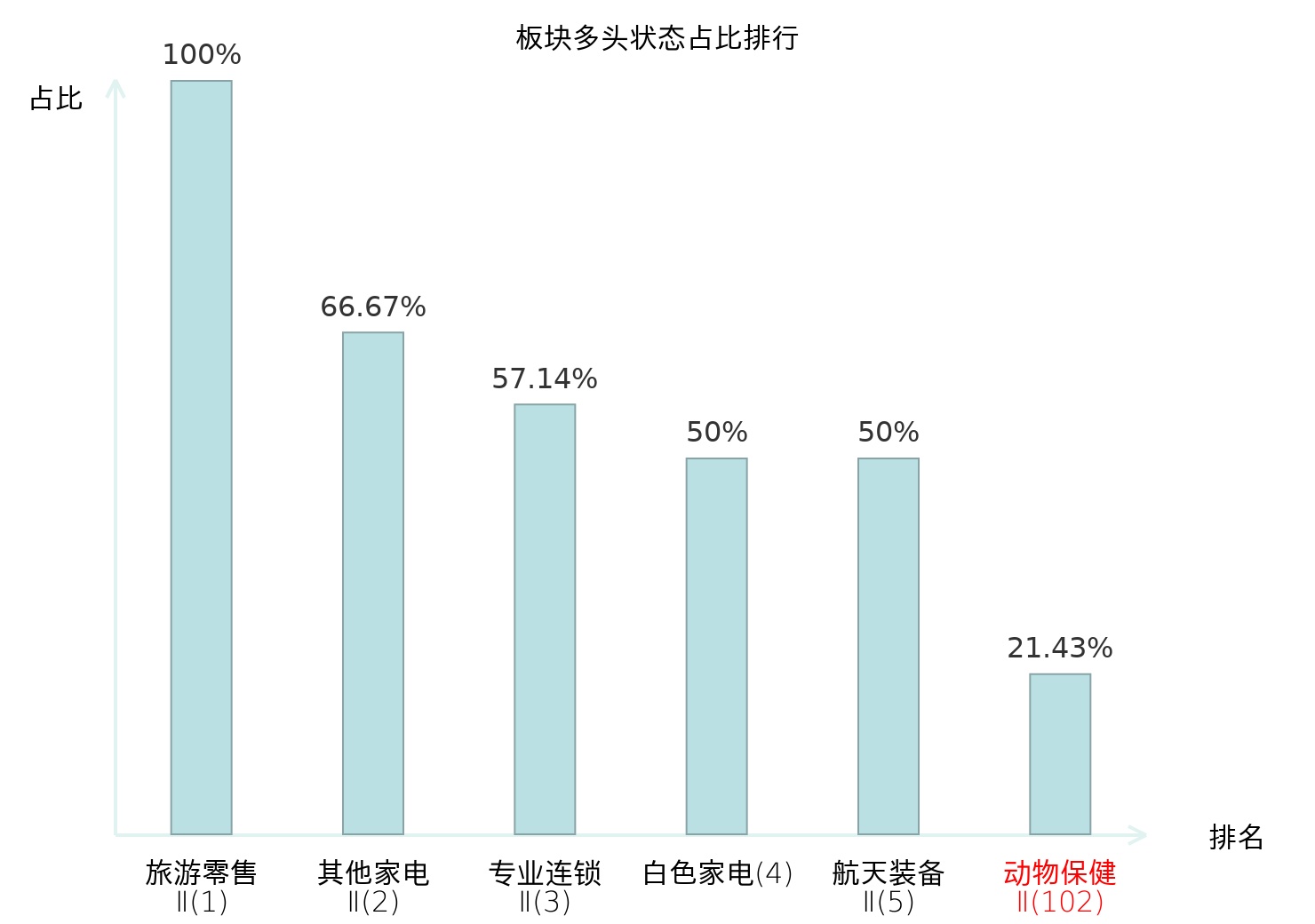 全市场所有行业板块中主力多头状态占比排名中,旅游零售Ⅱ板块位居第一。股份制银行Ⅱ板块名次提升最快,较昨日上升79位。