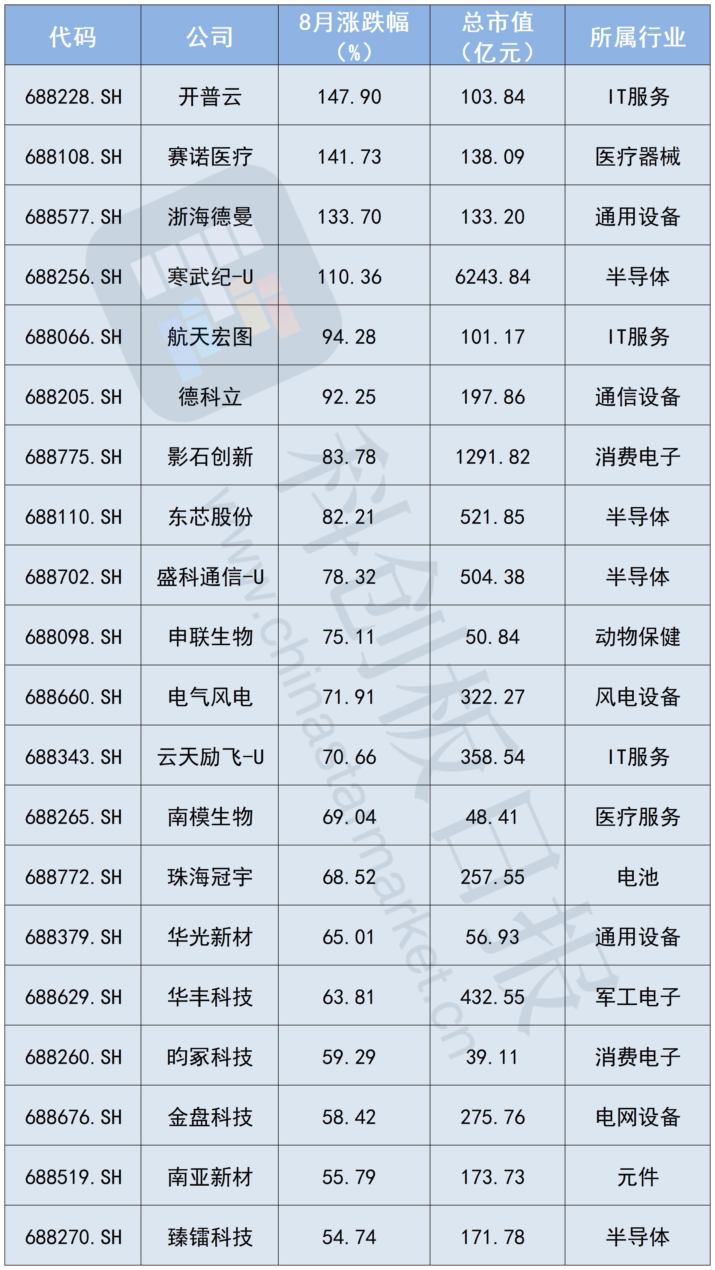 与此同时。市场上也涌现出一批“牛股”。《科创板日报》统计了科创板内8月涨幅排名前二十的个股。其中,并购重组概念股开普云以147.9%的涨幅位列第一。