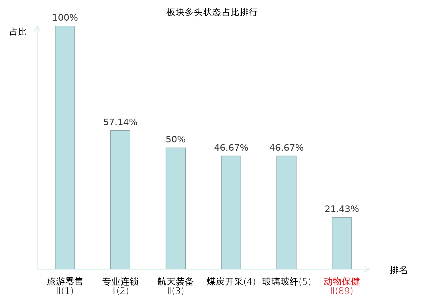 全市场所有行业板块中主力多头状态占比排名中,旅游零售Ⅱ板块位居第一。普钢板块名次提升最快,较昨日上升64位。