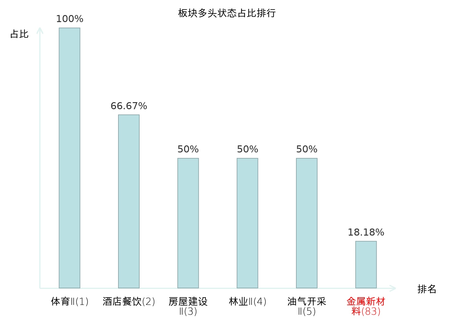 全市场所有行业板块中主力多头状态占比排名中,体育Ⅱ板块位居第一。国有大型银行Ⅱ板块名次提升最快,较昨日上升100位。