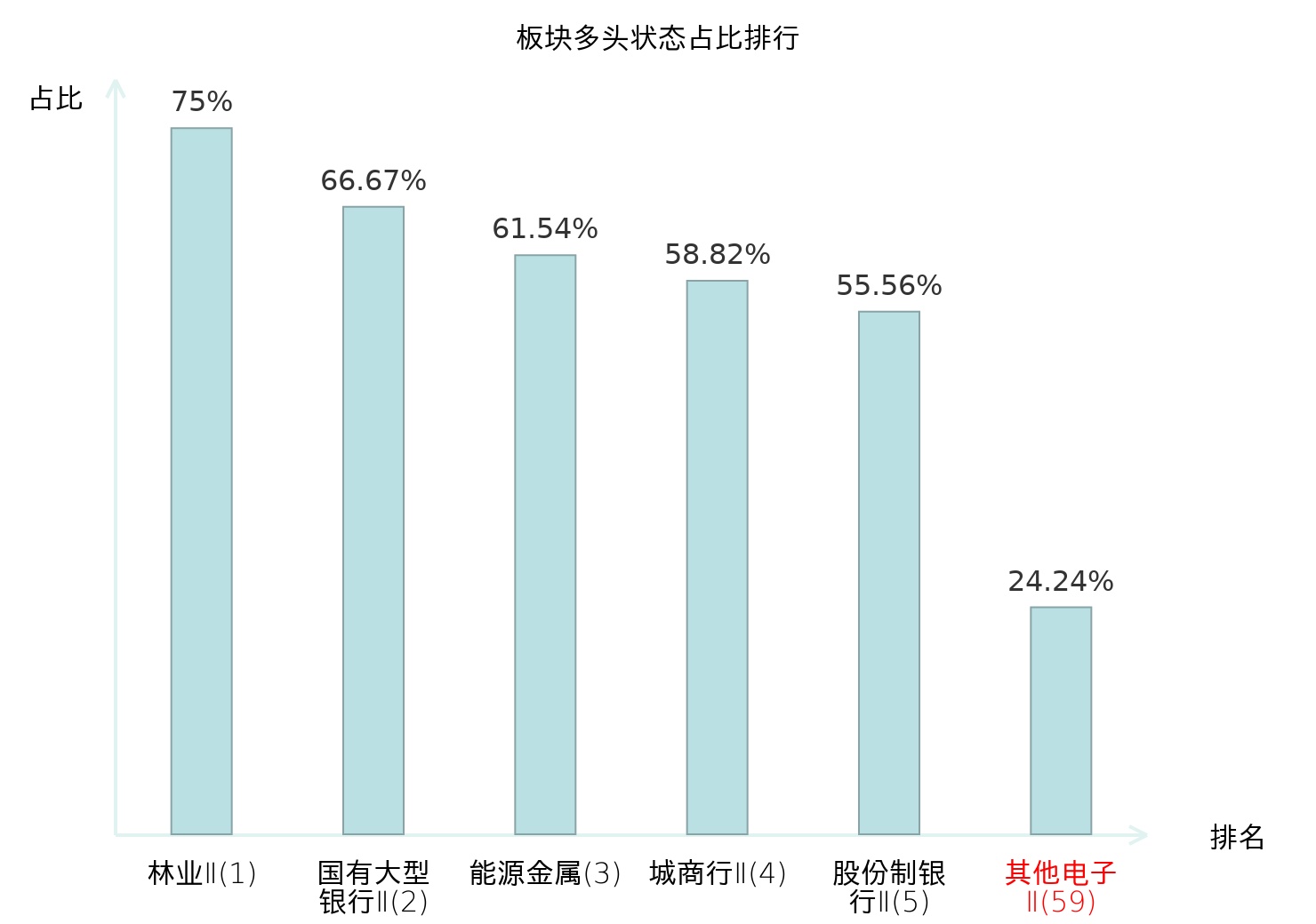 全市场所有行业板块中主力多头状态占比排名中,林业Ⅱ板块位居第一。专业连锁Ⅱ板块名次提升最快,较昨日上升63位。