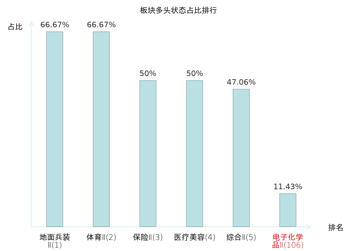 全市场所有行业板块中主力多头状态占比排名中,地面兵装Ⅱ板块位居第一。保险Ⅱ板块名次提升最快,较昨日上升82位。