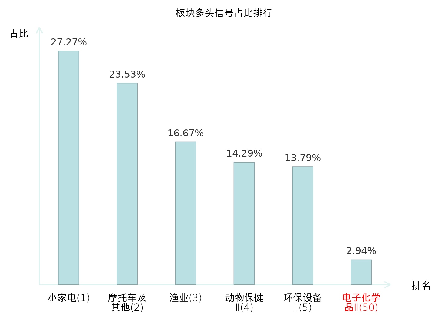 全市场所有行业板块中主力多头信号占比排名中,小家电板块位居第一。渔业板块名次提升最快,较昨日上升122位。