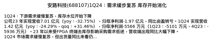 值得注意的是:2024年05月华泰证券的黄乐平/张皓怡/陈钰分析师,首次发布关于安路科技的研究报告,标题为:安路科技(688107)1Q24:需求缓步复苏 库存开始消化。