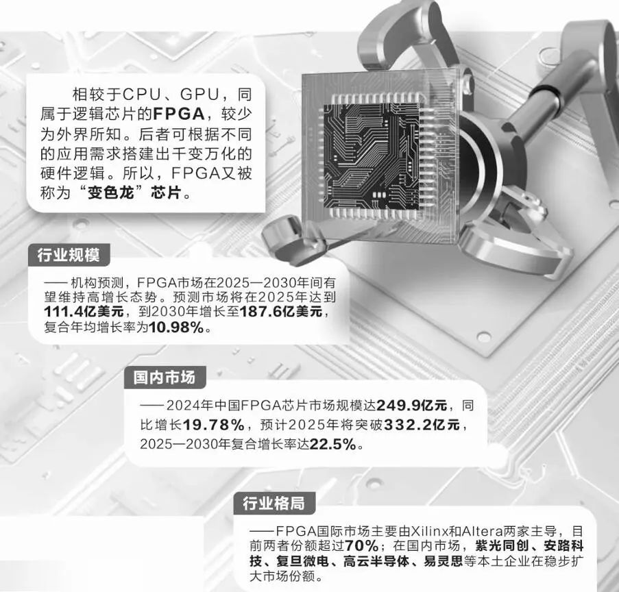 国内市场前景更为显著。据中研普华报告的预测,2024年中国FPGA芯片市场规模达249.9亿元人民币,同比增长19.78%,预计2025年将突破332.2亿元人民币,2025—2030年复合年均增长率为22.5%。