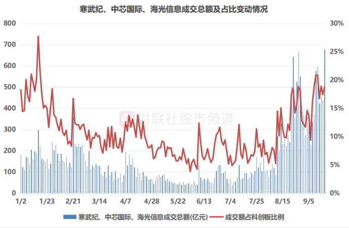 注:寒武纪、中芯国际、海光信息成交总额及占比变动情况(截至9月18日收盘)