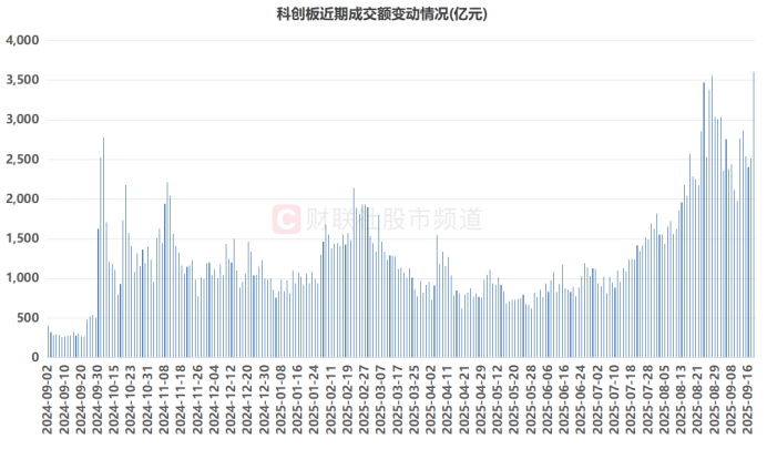 财联社9月18日讯(编辑 梓隆),今日(9月18日),A股市场整体放量明显,截至收盘,沪深京三市成交额达3.17万亿元,为历史第四高纪录,并在年内行情中位居第三名。其中,科创板持续聚集人气,全天成交额3610.47亿元,较昨日放量近1095亿元,同时也创历史新高。