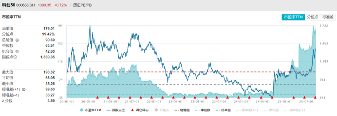 目前,科创50指数已连涨7日,从估值层面来看,其市盈率179.01倍,处于历史99.42%分位点;市净率6.34倍,处于历史69.57%分位点。同为科创板主要宽基指数的科创100、科创200近期也分别录得6连涨和3连涨,其市盈率分别达280.33倍、310.13倍,处于历史91.46%、85.93%分位点;市净率5.97倍、4.33倍,处于历史100%、99.62%分位点。