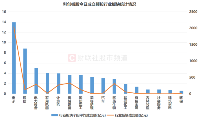 按行业来统计,科创板股覆盖的16个板块中,电子板块合计成交额2037亿元,并独占56%比例,机械设备、医药生物、电力设备、计算机、国防军工等紧随其后,成交额也均在100亿元以上。若统计板块个股平均成交额数据,电子板块以13.9亿元的规模同样位居第一,并远超第二位的通信板块(8.8亿元),电力设备、家用电器等板块个股成交额也相对居前。