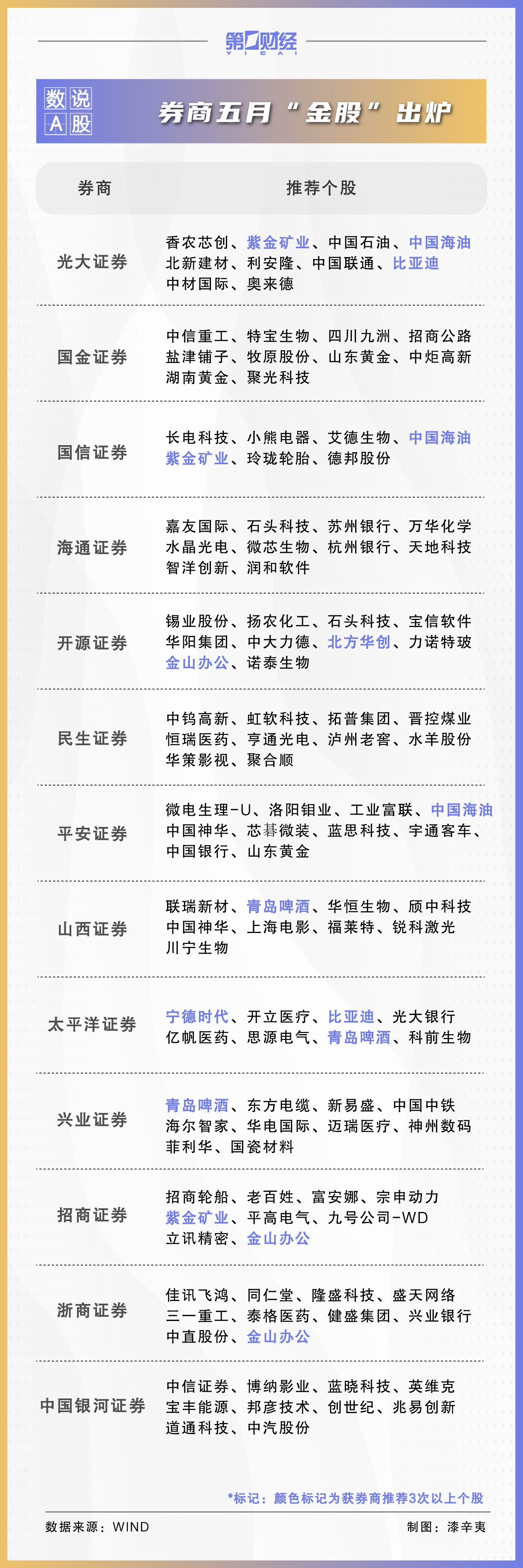 据不完全统计,在各家券商的“金股”名单中,获机构推荐次数最多的是中国海油、宁德时代、青岛啤酒,均获得4家券商的推荐。