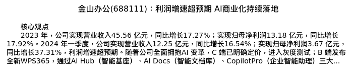 值得注意的是:2024年05月中信建投证券的应瑛/王嘉昊分析师,首次发布关于金山办公的研究报告,标题为:金山办公(688111):利润增速超预期 AI商业化持续落地。