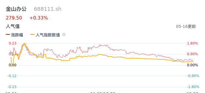05月16日,金山办公收报279.50,股价涨幅0.33%,成交金额6.12亿元,换手率0.47%。
