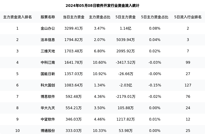 金山办公今日净流入3299.41万元,主力占比3.47%,在行业内排名:1/131;5日净流入1.14亿元,主力占比0.08%,在行业内排名:2/131。
