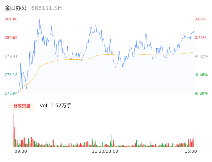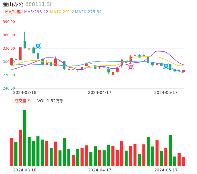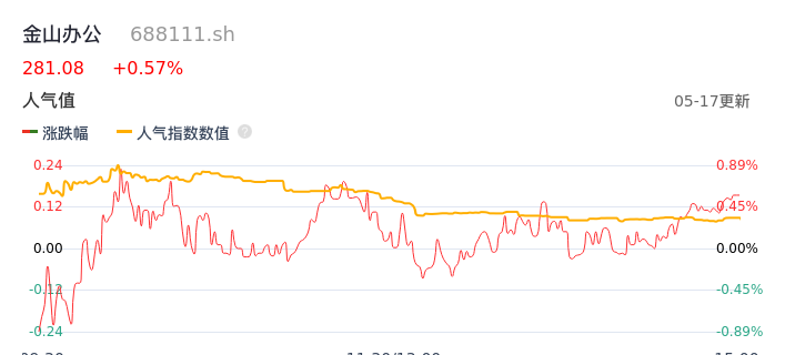 05月17日,金山办公收报281.08,股价涨幅0.57%,成交金额4.25亿元,换手率0.33%。