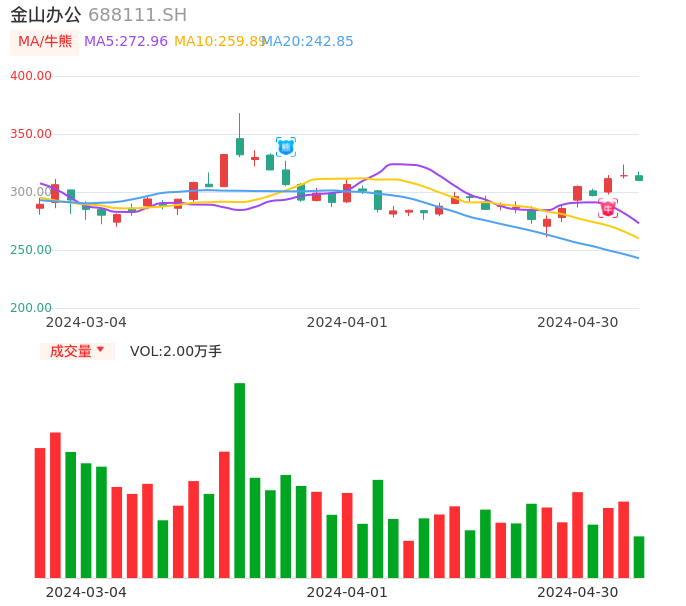 04月30日,金山办公收报310.00,股价涨幅-1.27%,成交金额6.26亿元,换手率0.43%。
