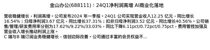 值得注意的是:2024年04月海通证券的杨林/杨蒙分析师,首次发布关于金山办公的研究报告,标题为:金山办公(688111):24Q1净利润高增 AI商业化落地。