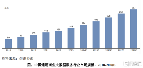 其中,2023年中国通用商业大数据服务市场规模为149亿元,预计到2028年将增长至287亿元,2023年至2028年的复合增长率为14%。