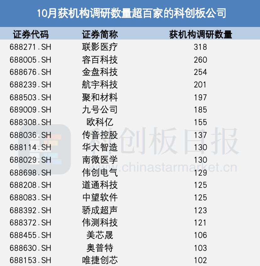 《科创板日报》11月3日讯(记者 黄修眉)财联社星矿数据统计显示,10月1日至10月31日,总共196家科创板公司获机构调研。