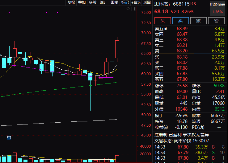 思林杰午后扩大涨幅,盘中涨幅一度超过9%,至收盘仍大涨8.26%。与此同时,思林杰成交也出现放量,全天成交1.14亿元,是上一交易日的3倍以上。