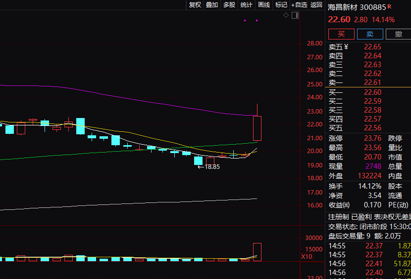 海昌新材午后快速拉升,盘中涨幅一度接近19%,后涨幅有所回落。成交方面,海昌新材今天全天成交超过5亿元,是上一交易日的10倍以上。