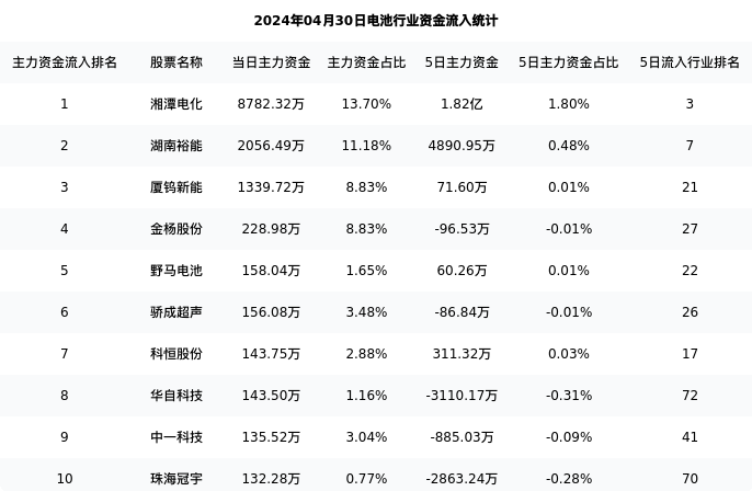 从主力资金流向来看,电池行业今日主力资金流入78.05亿元,在所有申万二级行业中排名:16/131。