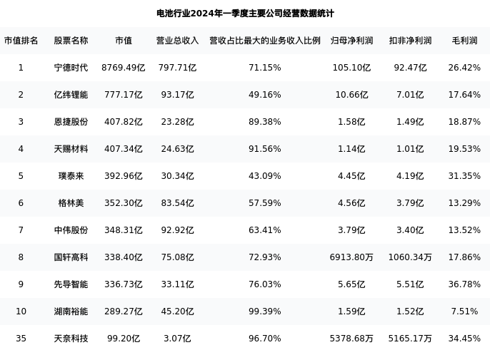 天奈科技最新报告期数据为一季度,下表汇总了电池行业内市值靠前的公司一季度主要经营数据