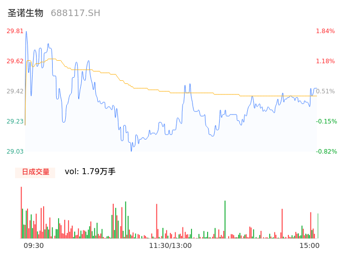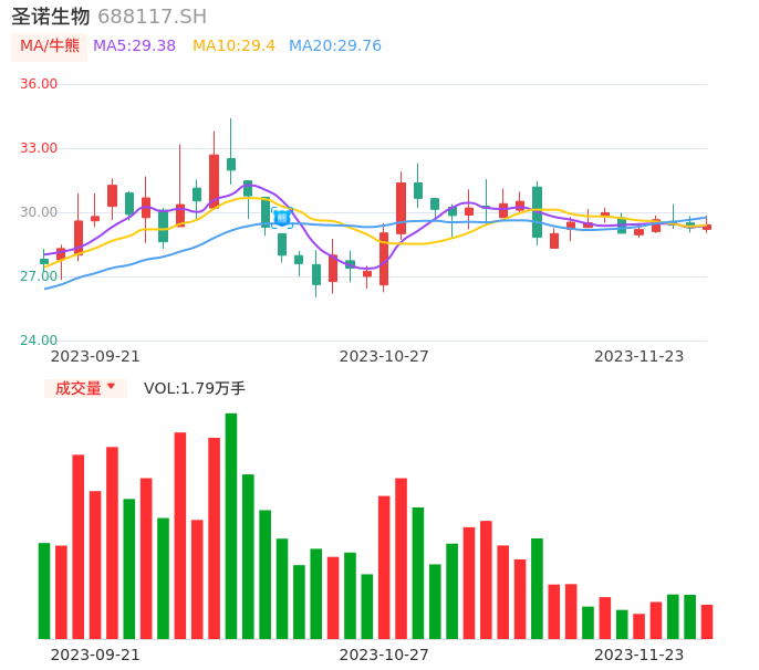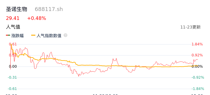 11月23日,圣诺生物收报29.41,股价涨幅0.48%,成交金额5255.19万元,换手率2.70%。