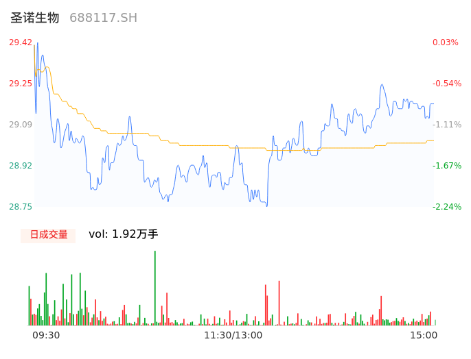 11月24日,圣诺生物收报29.14,股价涨幅-0.92%,成交金额5561.15万元,换手率2.89%。