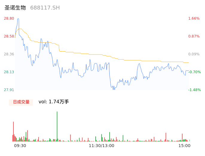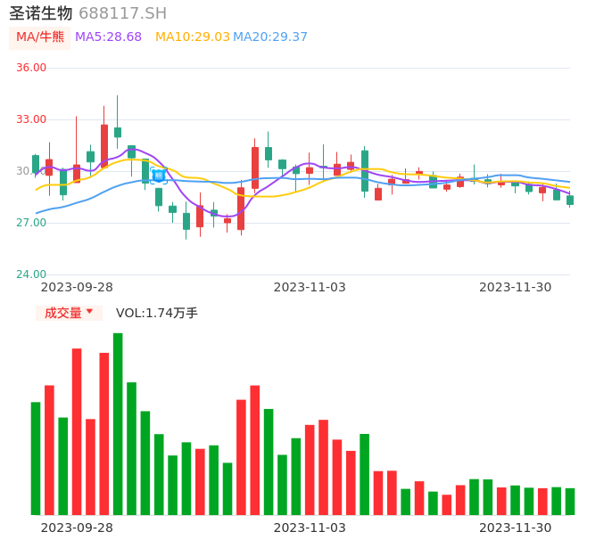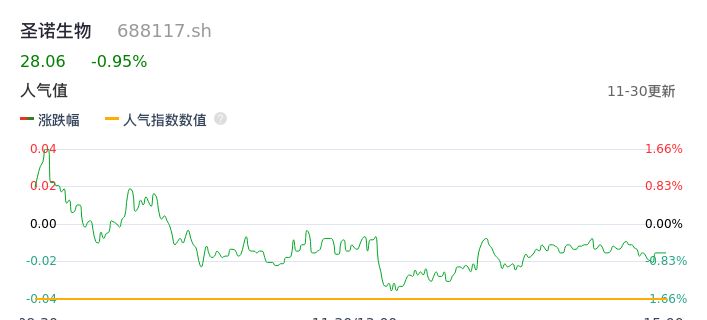11月30日,圣诺生物收报28.06,股价涨幅-0.95%,成交金额4915.73万元,换手率2.63%。