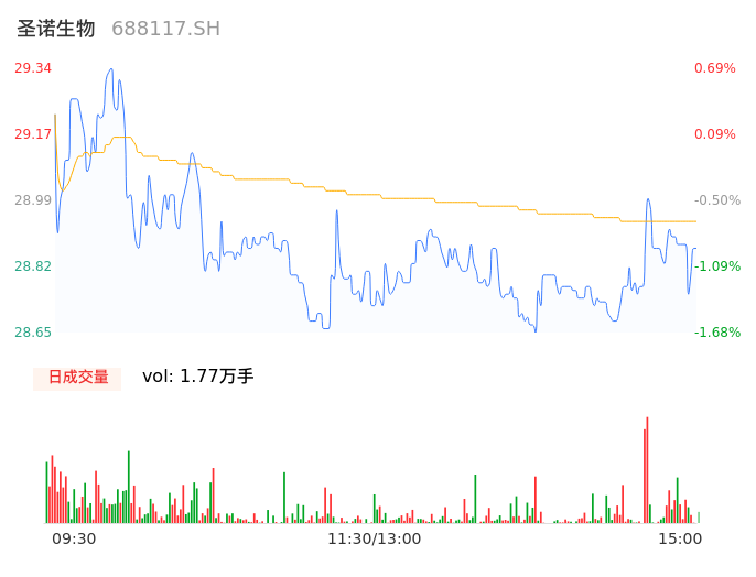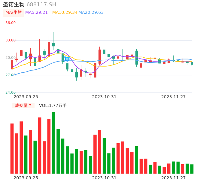 11月27日,圣诺生物收报28.81,股价涨幅-1.13%,成交金额5118.29万元,换手率2.67%。