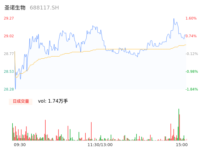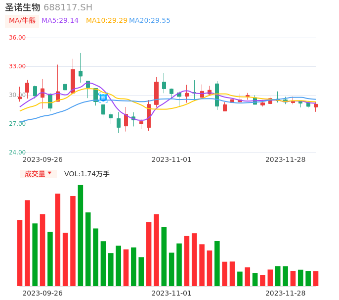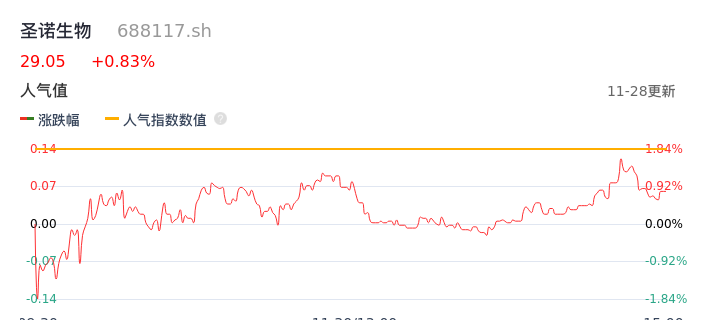 11月28日,圣诺生物收报29.05,股价涨幅0.83%,成交金额5020.20万元,换手率2.62%。