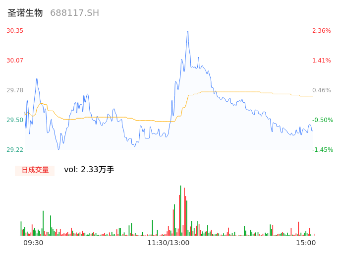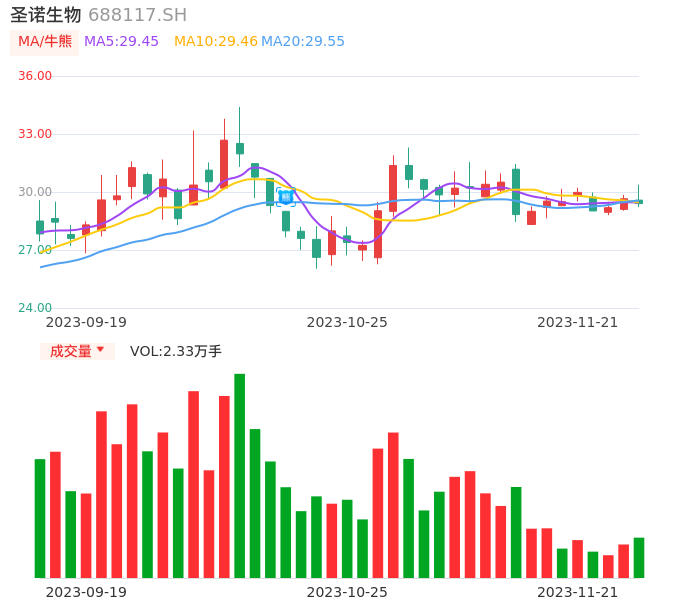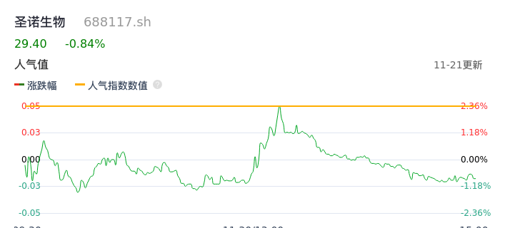 11月21日,圣诺生物收报29.40,股价涨幅-0.84%,成交金额6918.24万元,换手率3.51%。