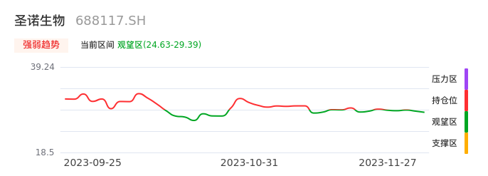 我们来看一下该股的九方特色指标强弱趋势的情况:圣诺生物自11月21日从持仓区下穿到观望区,股价近期持续走弱。短期已经进入空头行情,且下跌动能仍未衰竭。建议继续谨慎观望。