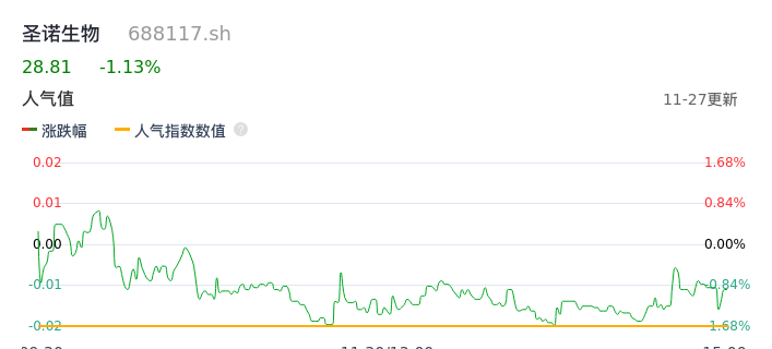 11月27日,圣诺生物收报28.81,股价涨幅-1.13%,成交金额5118.29万元,换手率2.67%。